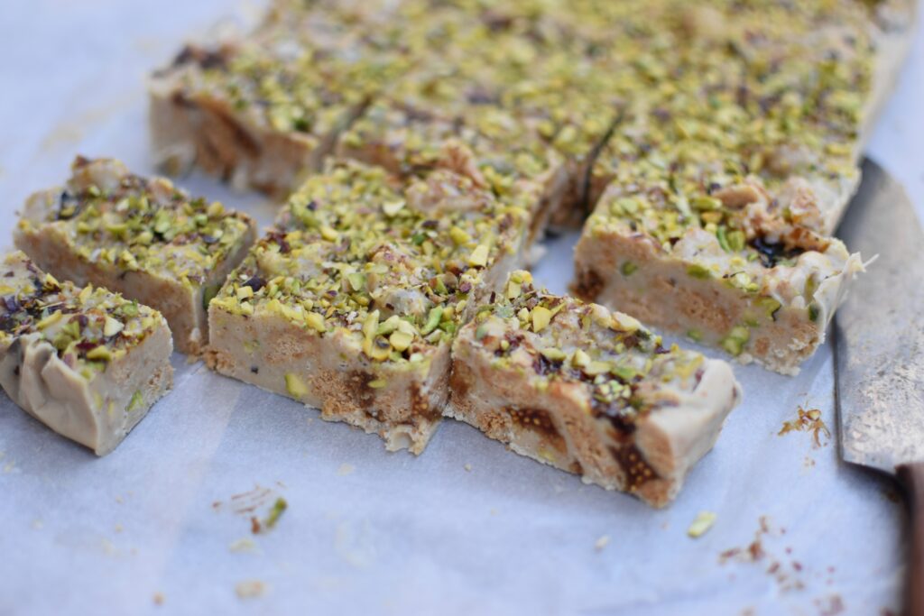 - Breek de chocolade in stukjes. Laat au bain marie smelten. Pas op dat er geen water bij de chocolade komt. Voeg, zodra de chocolade gesmolten is, de golden syrup en techina toe en roer tot een gladde substantie. Doe nu ook de koekjes, vijgen en de grove stukken pistache erbij en meng alles goed door elkaar met een pannenlikker.